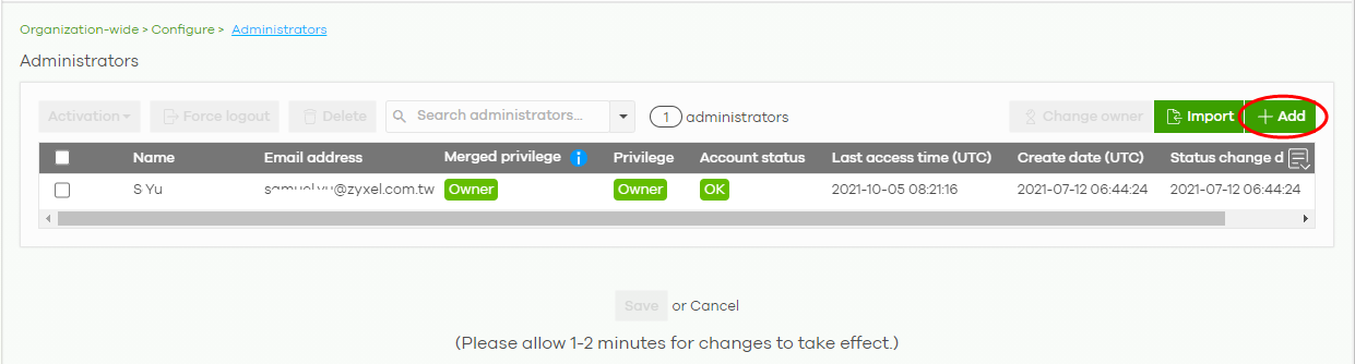 1 Go to the Organization-wide > Configure > Administrators screen. Click +Add.