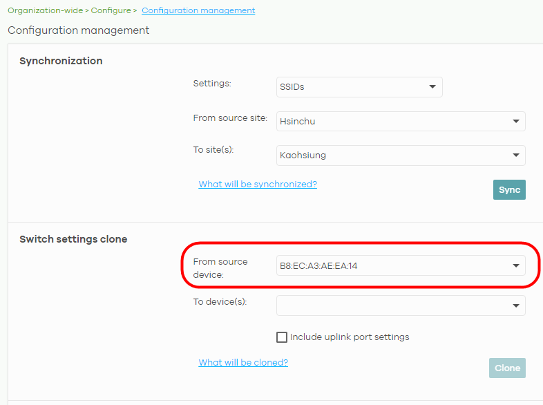 1 Go to the Organization-wide > Configure > Configuration Management screen. Under Switch settings clone, select the Nebula Device’s MAC address from the From source device drop-down list box. The cloned switch setting includes the port setting, IGMP advanced settings and STP bridge priority.