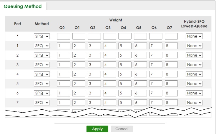 Method | Select SPQ (Strictly Priority Queuing), WFQ (Weighted Fair Queuing) or WRR (Weighted Round Robin). Strictly Priority Queuing services queues based on priority only. When the highest priority queue empties, traffic on the next highest-priority queue begins. Q7 has the highest priority and Q0 the lowest. Weighted Fair Queuing is used to guarantee each queue's minimum bandwidth based on their bandwidth portion (weight) (the number you configure in the Weight field). Queues with larger weights get more guaranteed bandwidth than queues with smaller weights. Weighted Round Robin Scheduling services queues on a rotating basis based on their queue weight (the number you configure in the queue Weight field). Queues with larger weights get more service than queues with smaller weights. |