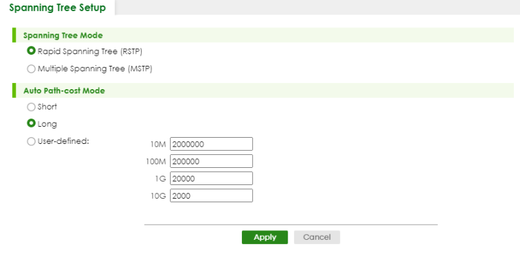 User-defined | Select this mode to manually set the auto path costs for each link speed. Enter the path cost value for each link speed. The range is from 1 – 2000000. It is recommended to assign this value according to link speeds. The slower the speed, the higher the cost. |