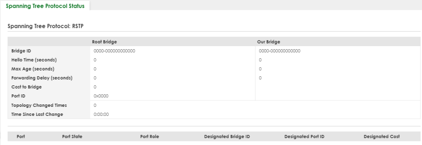 Port State | This field displays the port state in STP. • DISCARDING – The port does not forward or process received frames or learn MAC addresses, but still listens for BPDUs. • LEARNING – The port learns MAC addresses and processes BPDUs, but does not forward frames yet. • FORWARDING – The port is operating normally. It learns MAC addresses, processes BPDUs and forwards received frames. |