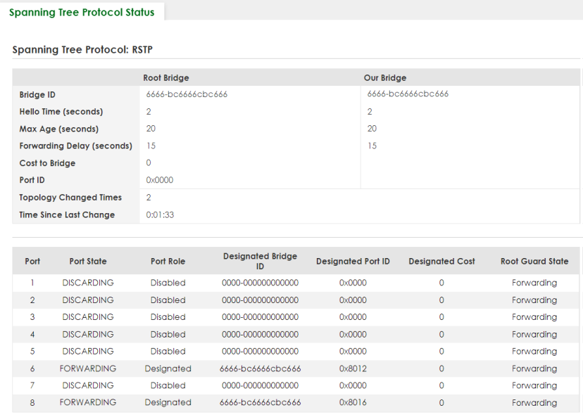 Bridge ID | This is the unique identifier for this bridge, consisting of bridge priority plus MAC address. This ID is the same for Root Bridge and Our Bridge if the Switch is the root switch. |