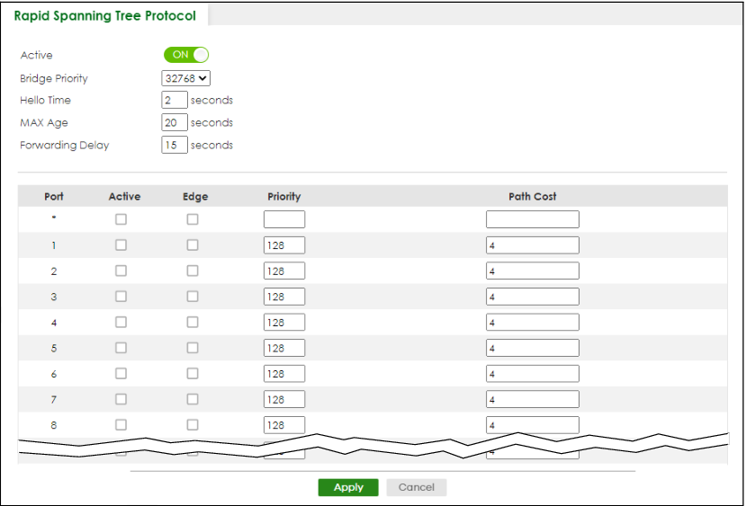 Priority | Configure the priority for each port here. Priority decides which port should be disabled when more than one port forms a loop in the Switch. Ports with a higher priority numeric value are disabled first. The allowed range is between 0 and 255 and the default value is 128. |
