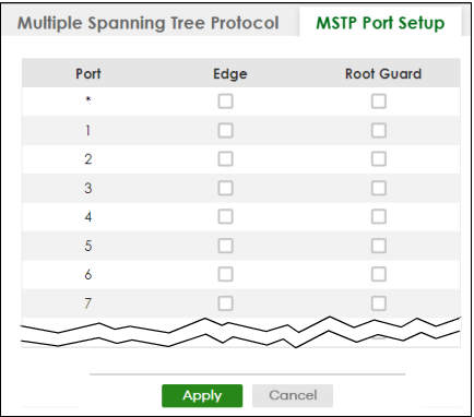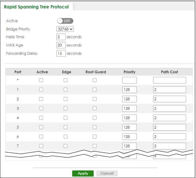 Spanning Tree Mode | You can activate one of the STP modes on the Switch. Select Rapid Spanning Tree or Multiple Spanning Tree. |