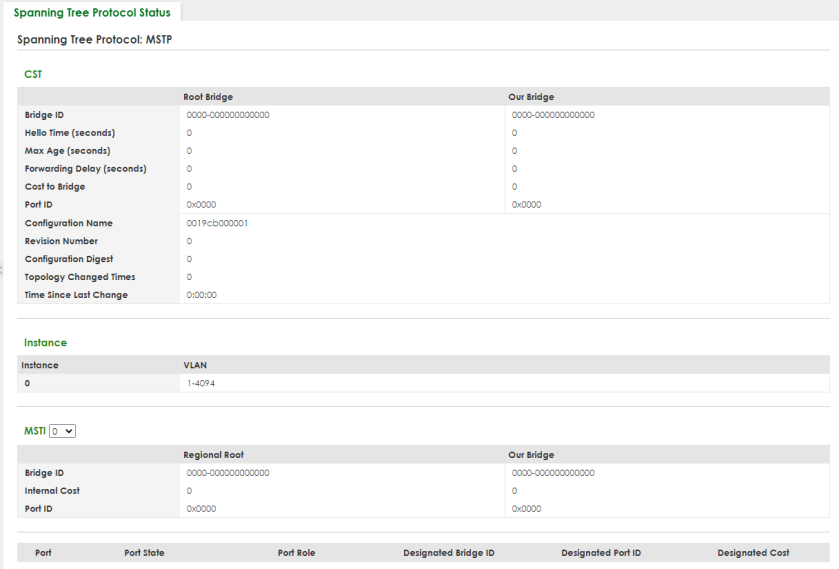Configuration Digest | A configuration digest is generated from the VLAN-MSTI mapping information. This field displays the 16-octet signature that is included in an MSTP BPDU. This field displays the digest when MSTP is activated on the system. |