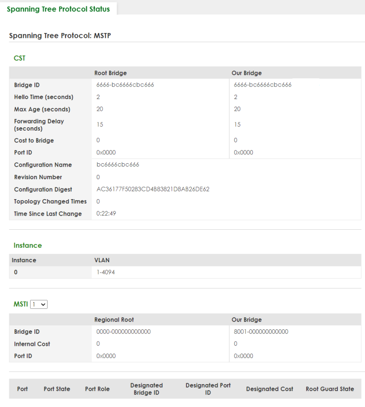 Bridge ID | This is the unique identifier for this bridge, consisting of bridge priority plus MAC address. This ID is the same for Regional Root and Our Bridge if the Switch is the root switch. |
