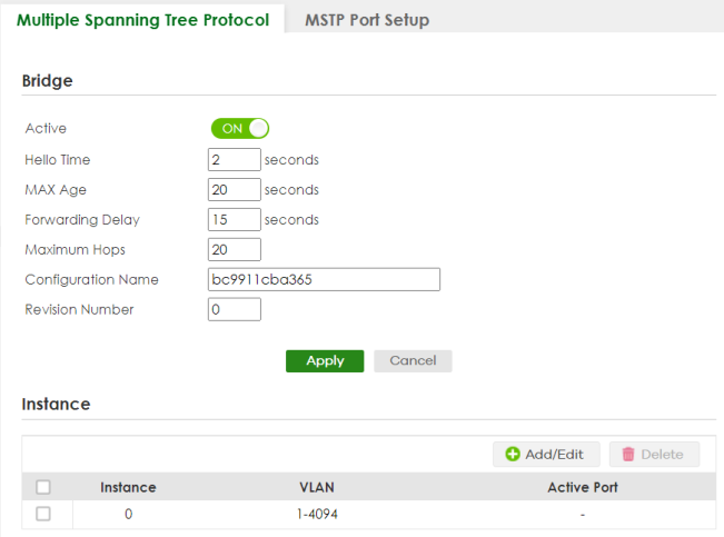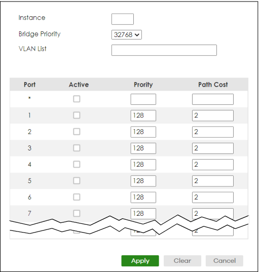 Instance Use this section to configure MSTI (Multiple Spanning Tree Instance) settings. | |
