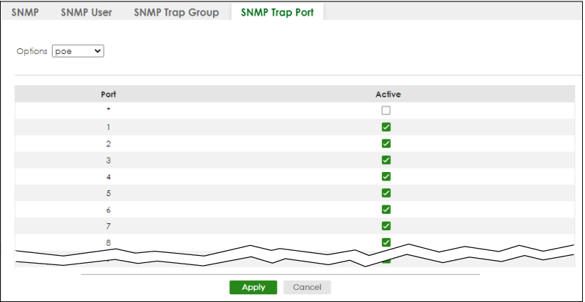 Active | Select this checkbox to enable the trap type of SNMP traps on this port. The Switch sends the related traps received on this port to the SNMP manager. Clear this checkbox to disable the sending of SNMP traps on this port. |